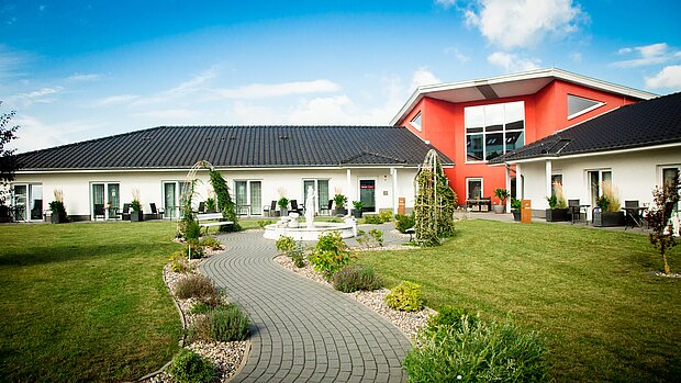 Unser 2016 erbautes Haus Auenland ist ein Ort zum Wohlfühlen. Die lichtdurchfluteten Zimmer bieten Blick ins Grüne oder in unseren liebevoll angelegten Innenhof. Im Zentrum des Gartens lädt ein Springbrunnen zum Verweilen ein.